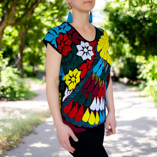 Handbestickte Bluse "Pavo Real" aus Mexiko - bunt