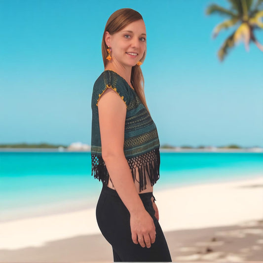 Gewebte Bluse mit Fransen "Caribe" aus Mexiko - dunkelgrün
