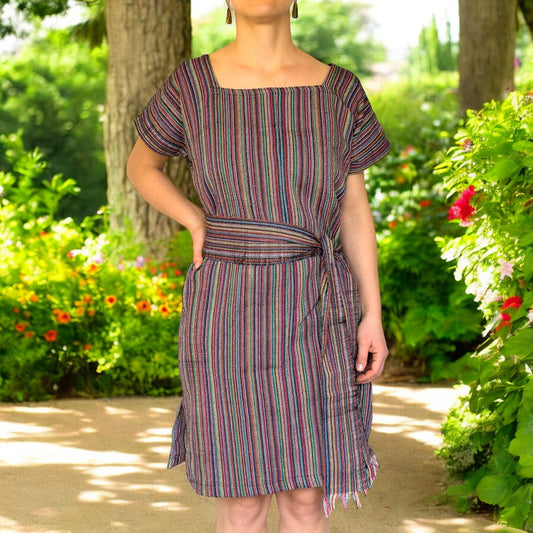 Gewebtes Kleid mit Gürtel und Raffung "Carmen" aus Mexiko - bunt