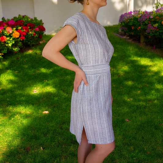 Gewebtes Kleid mit Gürtel und Raffung "Carmen" aus Mexiko - schwarz-weiß-beige