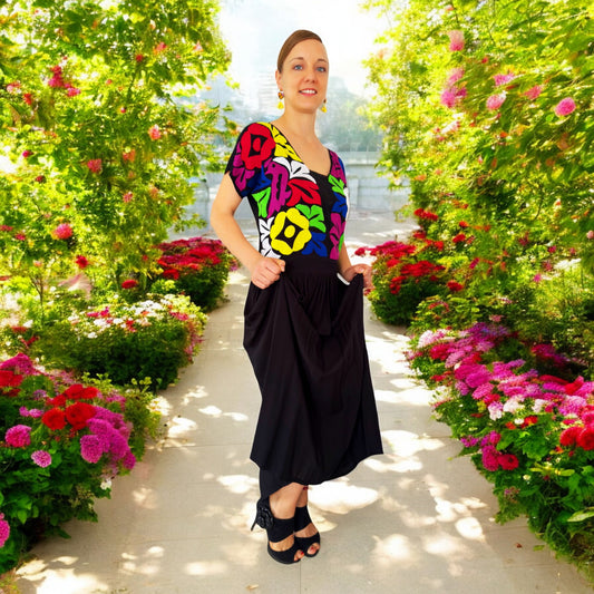 Handbesticktes Kleid "Nora" aus Mexiko - schwarz-bunt